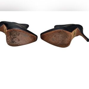 Women’s L.A.M.B. stiletto studded black leather, pull-on booties. Gold accent stud design. In good condition. The bottoms underneath when you turn them over show signs of previous use. Please see photos for more detail details. Smoke free home. Women’s size 6