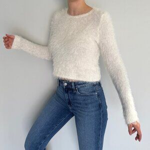 Soft fuzzy knit cropped sweater with a flattering fitted silhouette and long sleeves. Features a cozy eyelash texture and lightweight feel that works perfectly for layering or styling with high-waisted jeans.