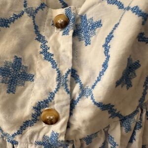 The Diana Dress is a printed cotton pouf-sleeved mini dress. It features an empire waist, non-functional buttons down the front, and an inner bodice at the bust. The sleeves have elastic and there is a center back zip closure.