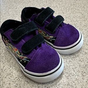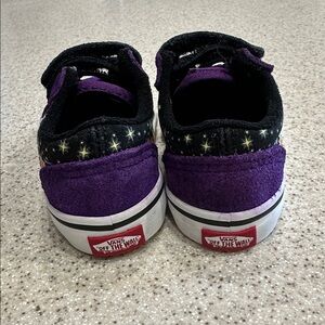 Oh my gosh! These glow in the dark 😱 I’ve never seen glow-in-the-dark vans. I will try very hard to capture a photo of it. It’s the skull and the wizard area that glows in the dark. Stylish kids shoes featuring a vibrant purple and black design. Perfect for everyday wear.