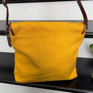 This Coach messenger bag features a bold and cheerful bright yellow canvas exterior paired with rich brown genuine leather trim for a classic yet eye-catching look. The structured messenger style is incredibly versatile and can be worn comfortably as a shoulder bag or crossbody thanks to the adjustable strap.