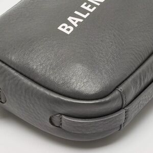 Elegant charcoal leather bag with sleek design. Features bold Balenciaga branding.