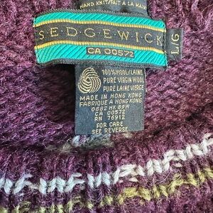 Experience vintage luxury with this stunning Sedgewick hand-knit sweater. Made from 100% Pure Virgin Wool, this piece features a heavy, high-quality knit with an intricate geometric/southwestern pattern in deep plum, forest green, and slate blue.