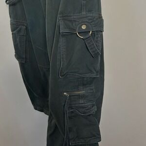 Sold out and hard to find Cult Gaia x Gap cargo pants in a dark forest green twill fabric. These utility-inspired trousers feature a high-rise waist, tapered leg, and multiple functional pockets including large cargo compartments on the thighs. Signature gold-tone hardware and a leather logo patch at the back waist add a premium touch to this limited edition collaboration. The design includes unique paneling, D-ring details, and a hammer loop for a modern workwear aesthetic.
