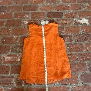 CAbi Sprinkle Size M Top 2019 #3764 Double Layer Chiffon Sleeveless V-Neck blouse. This vibrant orange tank top from CAbi features a sleeveless design and a flattering V-neck, perfect for warm weather. Made from lightweight fabric, it offers a comfortable and casual fit ideal for everyday wear. Fabric is sheer but has multiple layers so no cami needed. See photos for approximate measurements. 100% polyester.