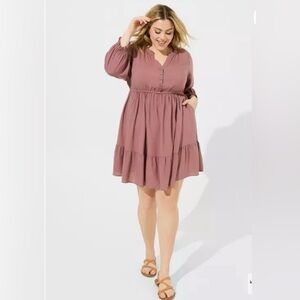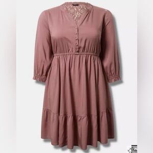 Chic long sleeve shirt dress in dusty rose. Features button details, delicate ruffles at the neck and wrist, as well as beautiful lace detail on the back. Perfect for spring and fall styles.