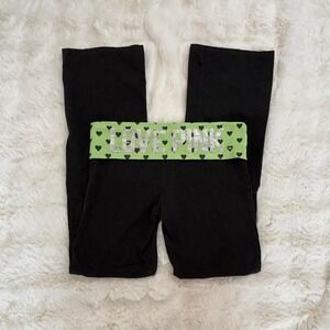black fold over flare yoga pants from victoria's secret pink with a green heart print waistband. stretchy, comfy, and very y2k. subtle sparkle logo on waistband. flattering flared leg.