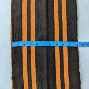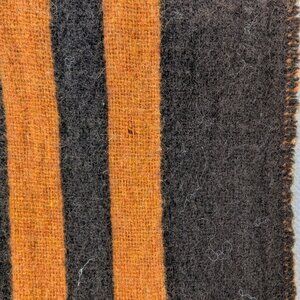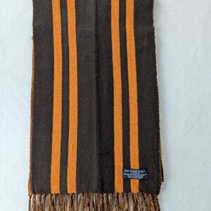 Add a bold touch to your wardrobe with this vintage Burberry brown striped scarf, featuring rich chocolate and burnt-orange vertical stripes for a striking, modern look. Made in Scotland from a premium blend of 90% merino wool and 10% cashmere, it offers soft warmth, breathable comfort, and an easy drape over shirts, sweaters, and coats. The long rectangular silhouette with twisted fringed ends is simple to wrap, knot, or drape, creating a versatile unisex accessory for everyday wear.