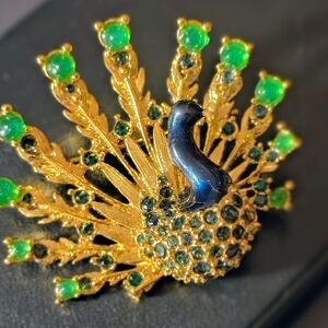 Add a touch of elegance with this stunning gold and green peacock brooch. Perfect for any occasion.