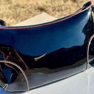 A patent leather bag from the TOMMY HILFIGER brand. Released in 1990, it belongs to the category of vintage bags. The inner lining of the pocket is bright red, and there is also one hidden zippered pocket.