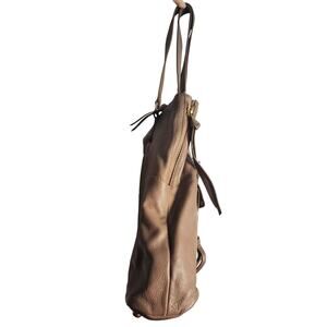 Style: Taupe leather tote bag. Genuine leather exterior. Gold hardware. Exterior front flap pocket with hidden magnetic closure. Expandable zippered sides for extended room. Zip top closure. Interior has two slip pockets and one zip pocket. Purple geometric fabric lining.