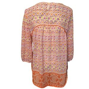 Red Camel bohemian peasant top in a vibrant orange and pink ikat geometric print. This lightweight blouse features a split neckline with long tassel ties and delicate crochet ladder trim detailing. The 3/4 length sleeves have elastic cuffs.