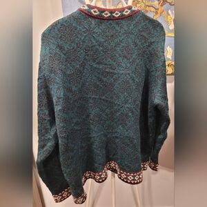 Cozy up in this stylish teal sweater with red accents. Perfect for any occasion.
