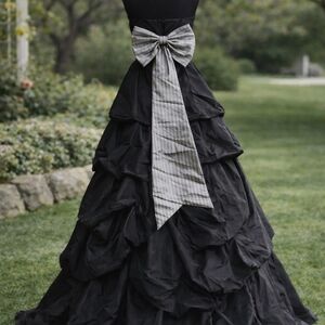 Make an unforgettable entrance in this dramatic strapless black ball gown. The standout feature is the oversized gray statement bow at the back, complete with long tapered tails that add striking contrast and elegance.