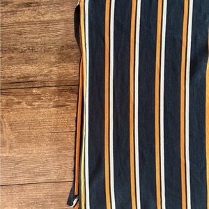 Shirt dress with navy, orange, and white stripes. Slit sides