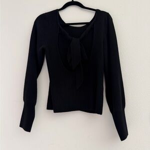 Chic black sweater with off-the-shoulder style. Features open back with bow detail. Perfect for a stylish look.