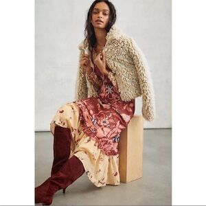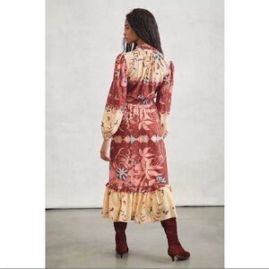 Anthropologie Othilia Carmela Maxi Dress featuring V-neck with Ties; Smocked Elastic Waist; Elastic Cuffed Long Sleeves; Awesome Sideseam Pockets; Flounced Skirt Hem. 100% Cotton with 100% cotton lining, very lightweight. Rust and cream abstract floral pattern, with tie-dye element and modified transition colorblock. Timeless style! Great for layering, travel, and versatile wear. Size L NWT