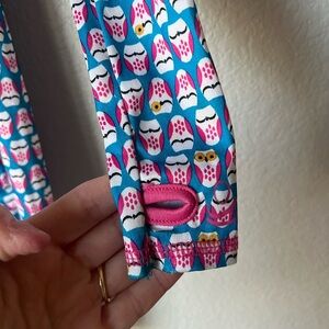 Adorable thermal long-john set with pink and blue owl print. Soft and comfortable for kids. Thumb hole
