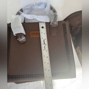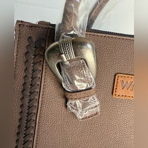 Wrangler tote bag crafted from western buckle and genuine leather whipstitch details.