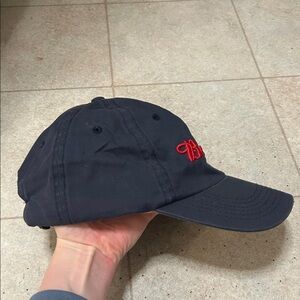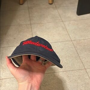 Dark blue hat featuring a bold red Budweiser logo. Perfect for casual wear.