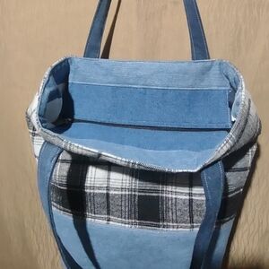 Made from old jeans and flannel shirt. Sewed in a regular sewing machine, with some little imperfections but no effect on the functionality.