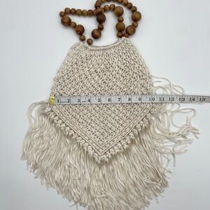 Boho Macrame Fringe Bag Wood Bead Handle Cream White Textured Woven Festival bag
