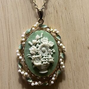 Vintage Gold and Sage Green Floral Cameo Pendant Necklace 18” spring ring clasp