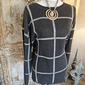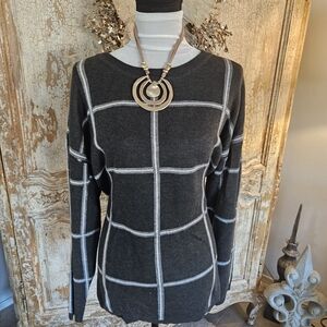 Elegant crew neck sweater with a grid design. Black base with white lines. Ideal for everyday style.