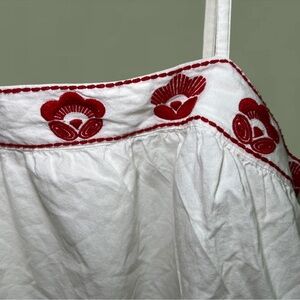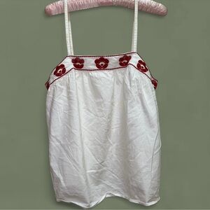 Chic camisole with vibrant red floral embroidery. Soft white fabric. Ideal for layering or standalone wear.