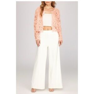 She + Sky Long Sleeve 3D Mesh Short Jacket Cardigan Flower appliqué in Pink