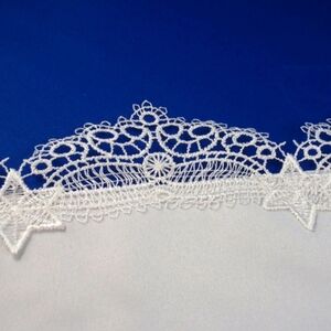 European design with frosted silver blue embroidered bell medallion lace inserts on white satin.