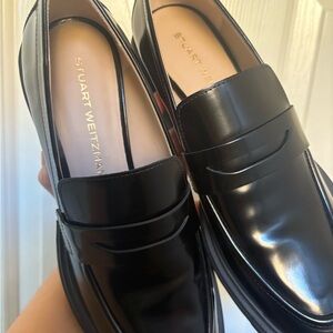 Brand new Stuart Weitzman black platform loafers featuring a sleek penny-loafer design with a bold chunky lug sole. Super polished yet edgy — perfect for elevating everyday outfits or pairing with trousers, denim, or dresses.