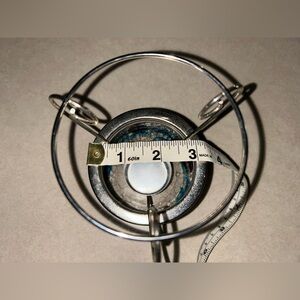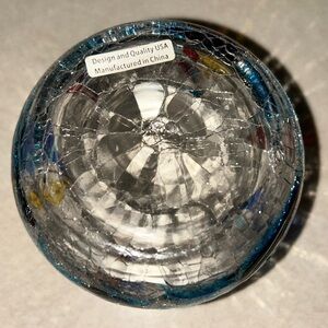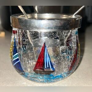 3-piece glass and metal set featuring a crackle glass sailboat bottom, a metal stand that holds a tea light candle, and a glass dish on top to hold wax melts or fragrance oils. This was only ever displayed for decorative purposes, never actually used. There's a small scratch on the glass top piece (pictured) but it shows more in the picture than in real life because it caught the flash from the camera. Stands about 5.5 inches tall when fully assembled. Smoke free home.