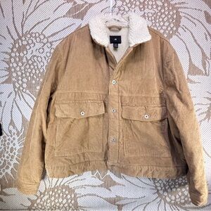 Stay warm and stylish with this tan corduroy jacket featuring a cozy sherpa collar. Perfect for layering in cooler weather.