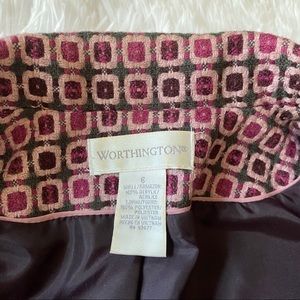 Turn heads with this bold vintage Worthington two-piece set featuring a mod-inspired geometric print blazer paired with a coordinating fuchsia lace-trim camisole. A striking, stylish combo perfect for adding personality to your wardrobe.