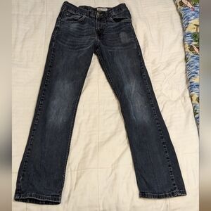 Wrangler dark blue almost off black slim straight jeans size 29 X 30. please have a single button and zipper closure. two front pockets, coin pocket, and two back pockets. the tag is not in great shape with the jeans are in good condition. my 14 year old just grew 3 inches so I have a few pairs of jeans in my closet in similar sizes and styles. I offer 50% off of any bundle of two items or more so bundle and save