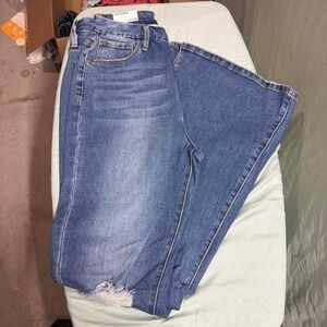 High-waisted, distressed, flared blue jeans with a 13.5" rise and 30" inseam #flaredjeans