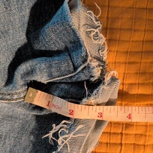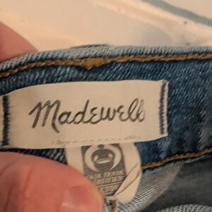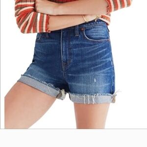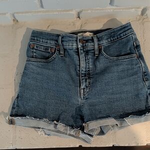 Madewell High-Rise Denim Shorts with a frayed hem in a blue wash.