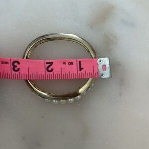 This elegant gold ring features a row of lustrous pearls, perfect for adding a touch of sophistication to any outfit.