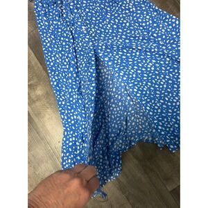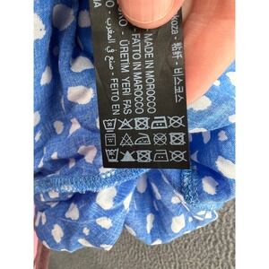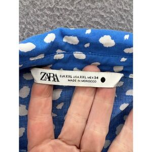 Zara blue and white printed maxi shirt dress features a vibrant dalmatian-style spot pattern throughout. This long-sleeve midi to maxi length dress is designed with a classic collar, full button-down front, and a matching fabric tie belt to cinch the waist. Crafted from a lightweight, flowy fabric, it offers a relaxed yet polished silhouette perfect for casual outings or workwear.