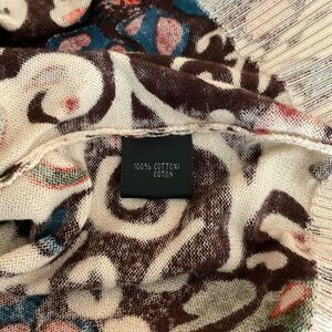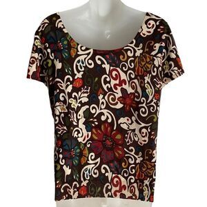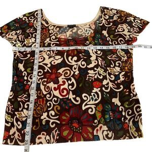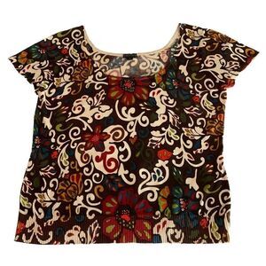 Lafayette 148 New York Blouse T-shirt Sequined Beaded in Tan Brown Red Blue Green Floral Square Neck Short Sleeves Women Size Large Boho Hippie Fun
