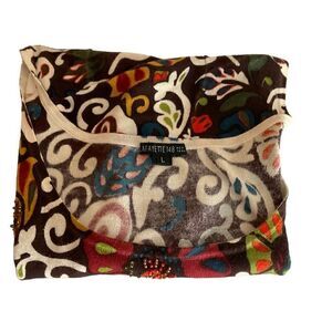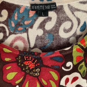 Lafayette 148 New York Blouse T-shirt Sequined Beaded Floral Tan Brown Red Large