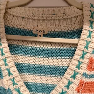 Vibrant V-neck sweater with teal and orange stripes. Features cable knit details. Cozy and chic design.