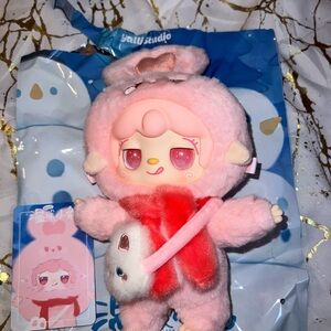 Adorable pink plush doll featuring a cute red scarf. Perfect for kids or adults.