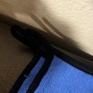 Soft blue microfiber towel with black trim. Ideal for cleaning and drying.