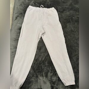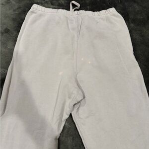 XL top (hits at waist), M bottoms. This is a Reposh. Purchased with a couple bleached stains on the joggers (one on the bottom front leg and a couple on the back-all pictured) but hardly noticeable when wearing! It’s a beige/light purple color.