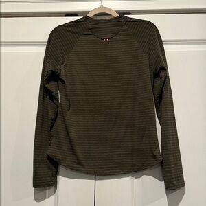 Olive long sleeve with subtle stripes. 89% poly, 11% cotton. Thumb holes and curved bottom hem. Great winter running layer. Fitted medium.