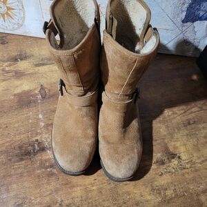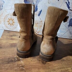 UGG Chaney style. These mid-calf boots are made of water-resistant suede in the classic chestnut color, featuring a moto-inspired design with decorative buckles and a convenient side zipper closure.