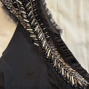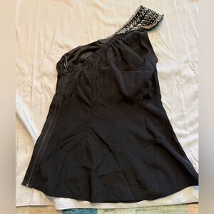 Statement one-shoulder black top by Bebe featuring dramatic silver-toned jeweled embellishment along the neckline. This piece is classic early-2000s Bebe — sleek, sexy, and made for nights out.
