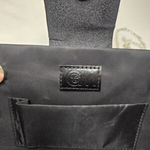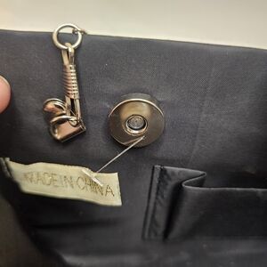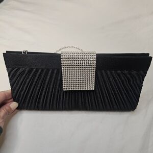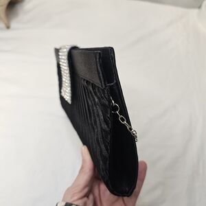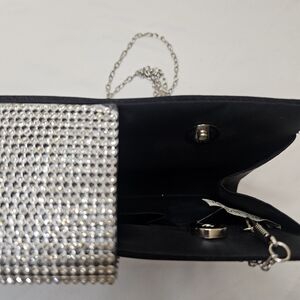 This elegant black evening clutch is perfect for any special occasion. Featuring a sleek design with a sparkling silver chain, it adds a touch of sophistication to your outfit. The clutch is versatile and stylish, making it a must-have accessory.